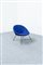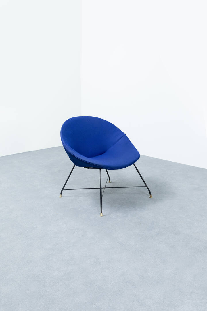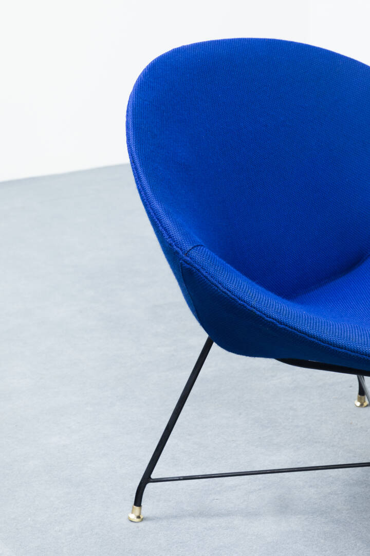 Poltrona con struttura in metallo verniciato finali in ottone e rivestimenti in tessuto.