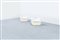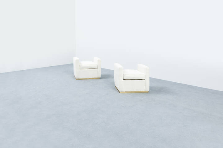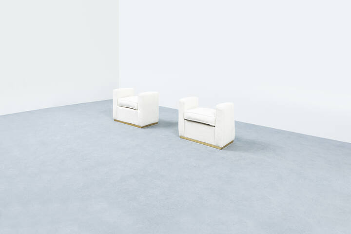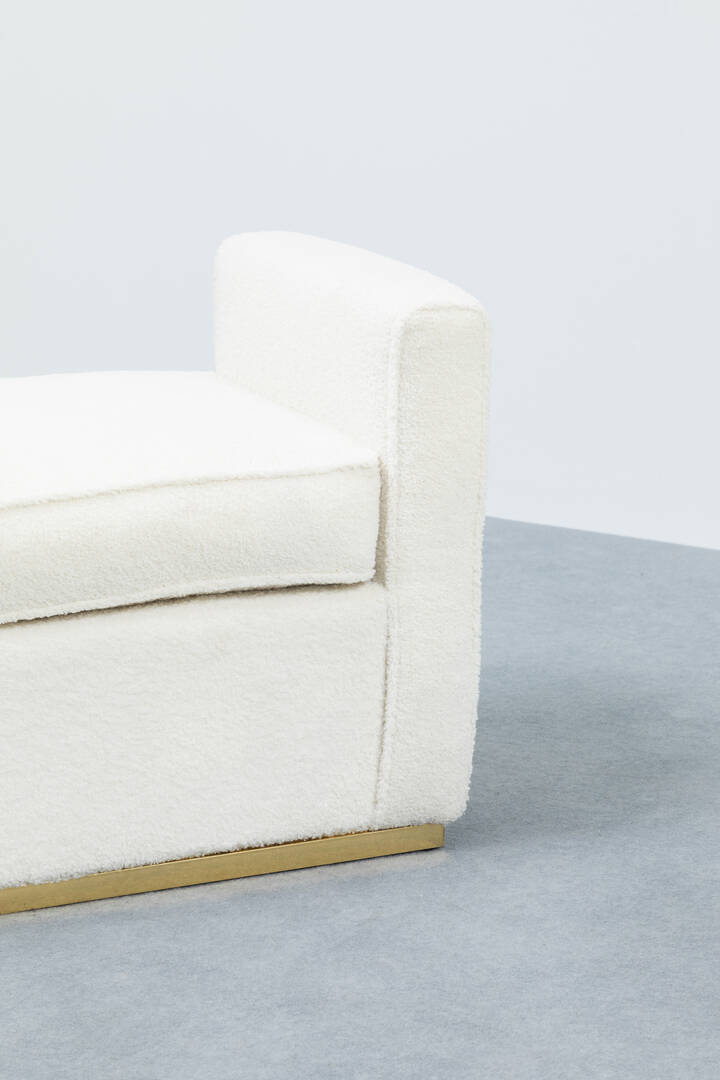 Coppia di panchette con imbottitura rivestita in tessuto bouclé, struttura in legno, particolari in ottone