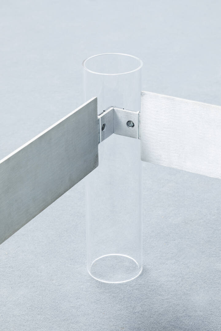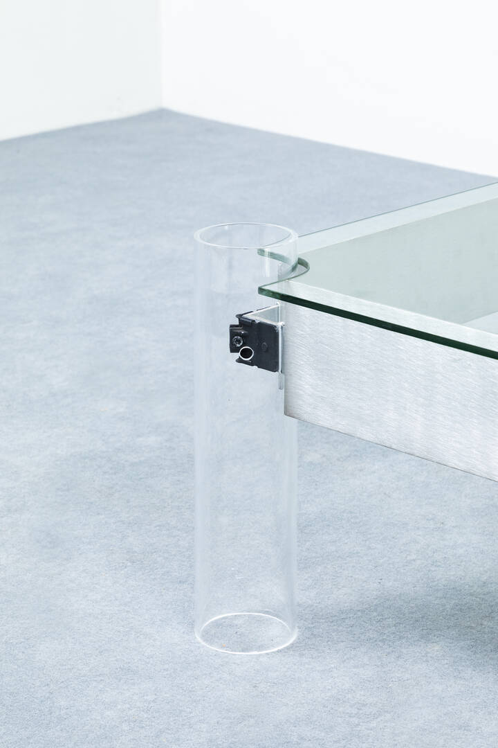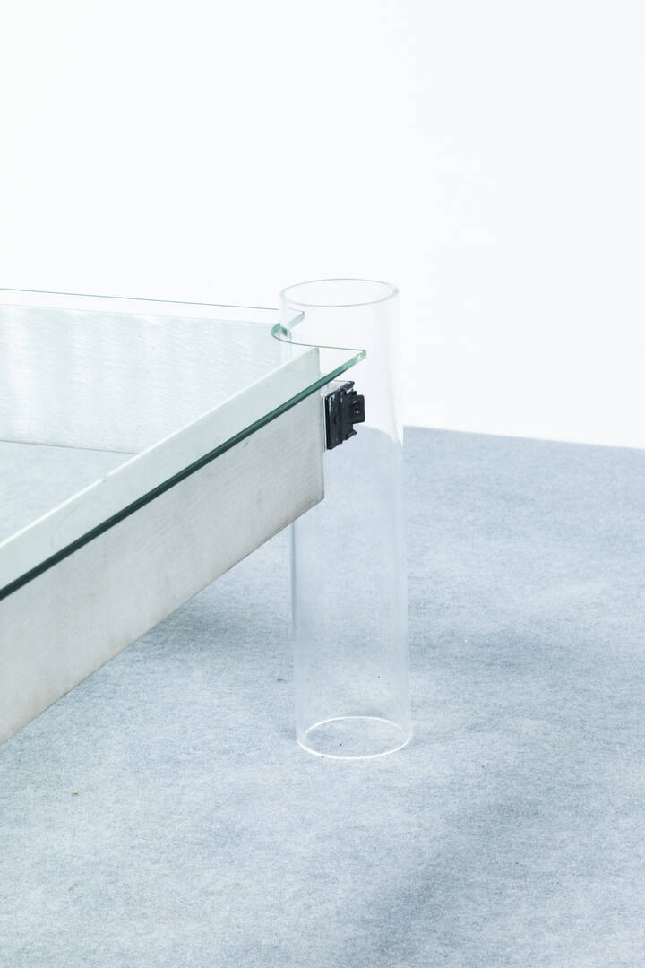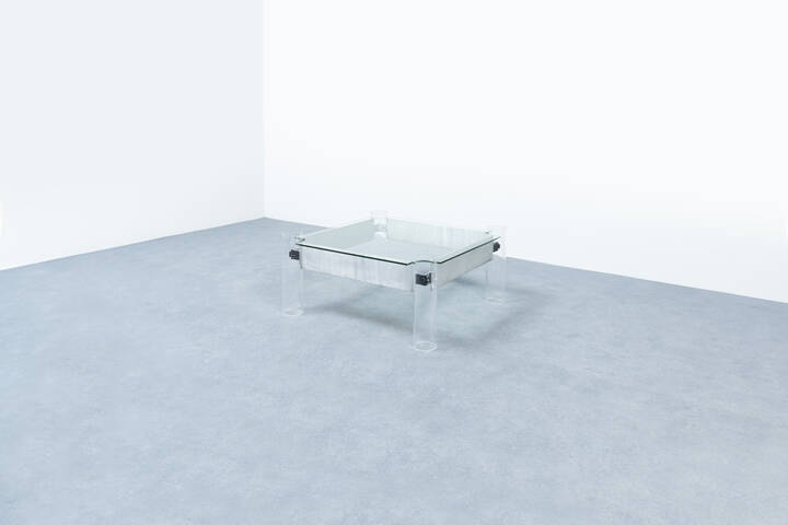 Tavolino da soggiorno con struttura in fusione di alluminio, gambe in plexiglass, piano in vetro.