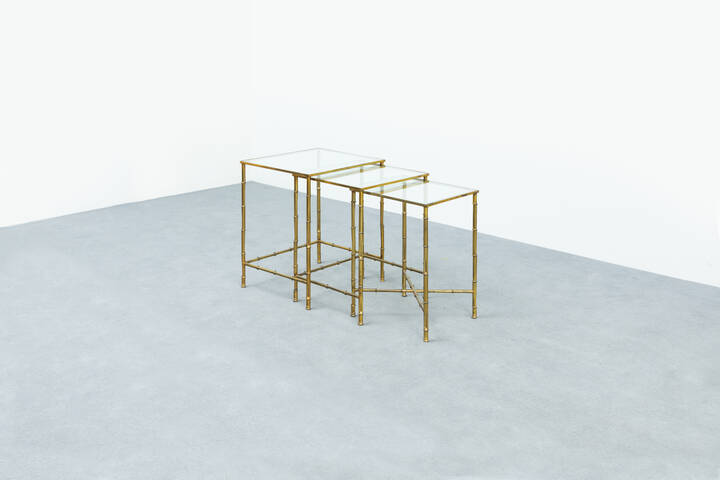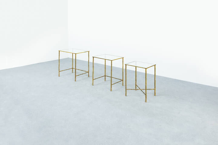 Previous Lot 401 Next Sant’Agostino - Corso Tassoni 56, 10144 Torino 193 Prima tornata Tuesday 9 November 2021 hours 16:00 (UTC +01:00) MAISON BAGUES MAISON BAGUESTre tavolini con struttua in ottone, piani in vetro.Anni '50