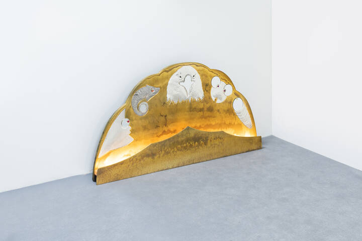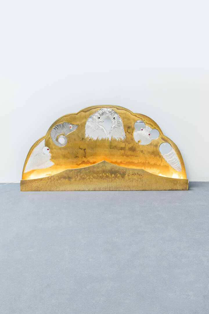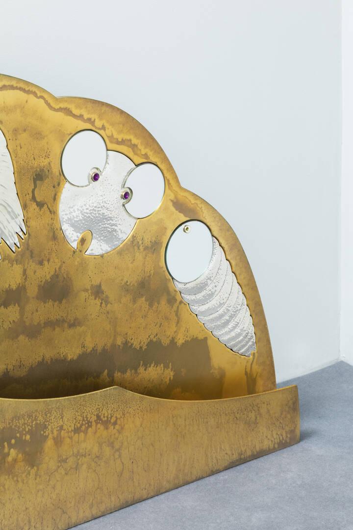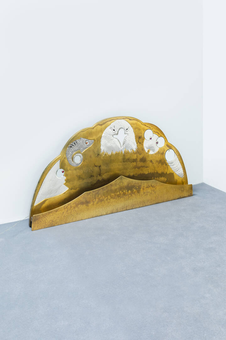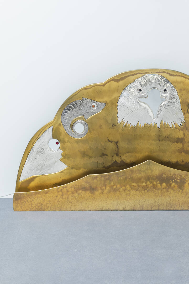 Testiera porta riviste con animali "acqua, terra aria". Fondo laccato, animali in bronzo argentati.