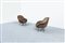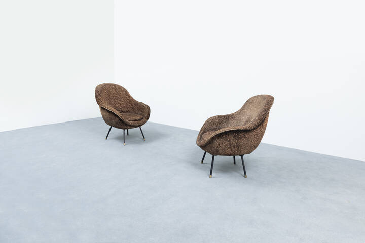 Coppia di poltrone con struttura in legno, rivestimento in tessuto, gambe in metallo, puntali in ottone.