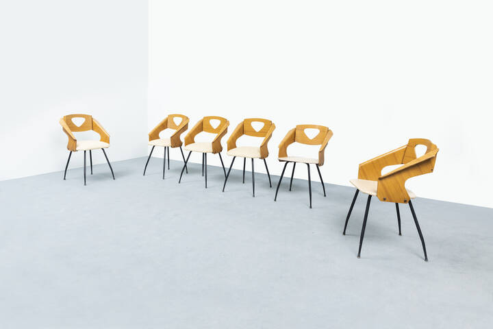 Sei sedie in compensato. gambe in tondino di metallo verniciato.