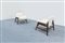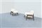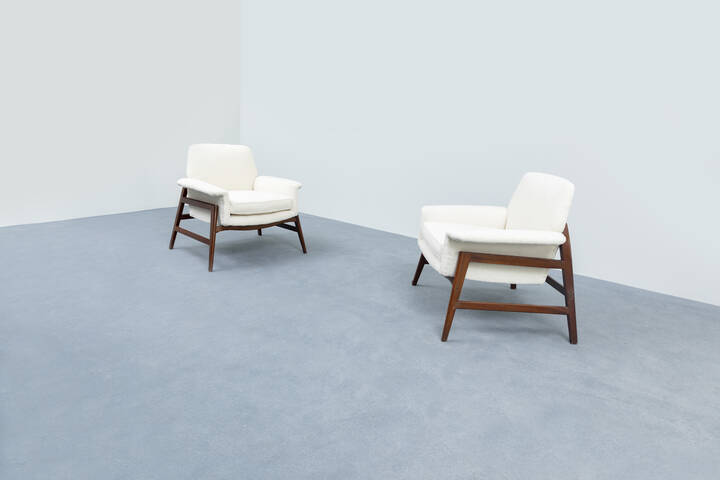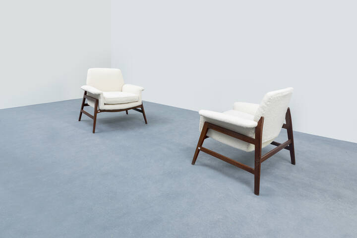 Coppia di poltrone con struttura in legno e rivestimenti in tessuto bouclé.