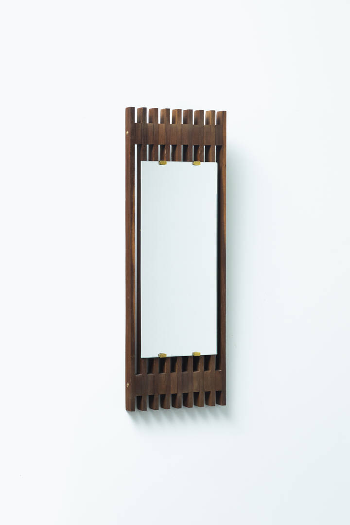 Specchiera in legno di teak, vetro specchiato, particolari in ottone.