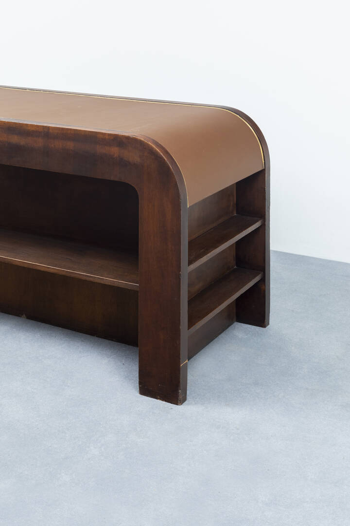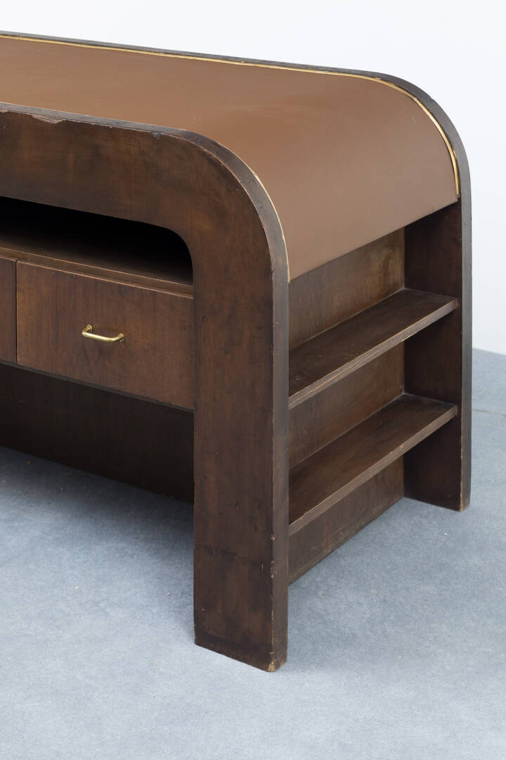 Grande mobile contenitore da centro, struttura in legno, piano in pelle e particolari in ottone.
