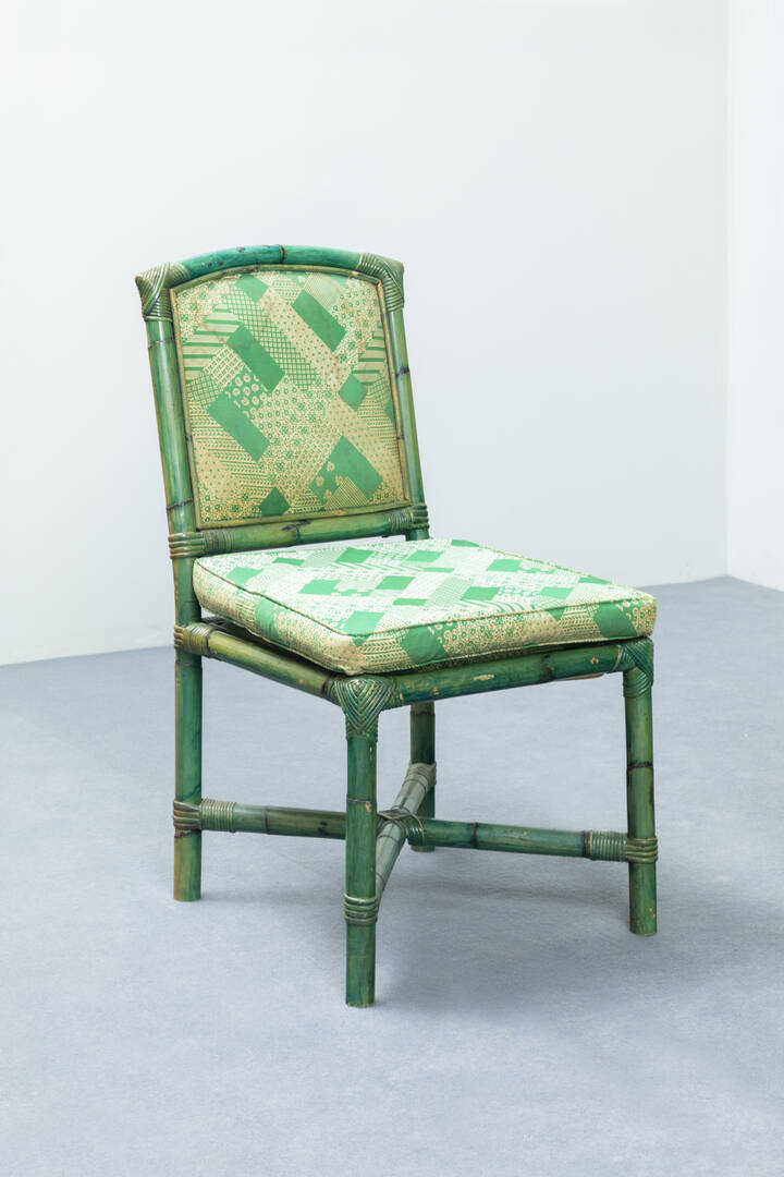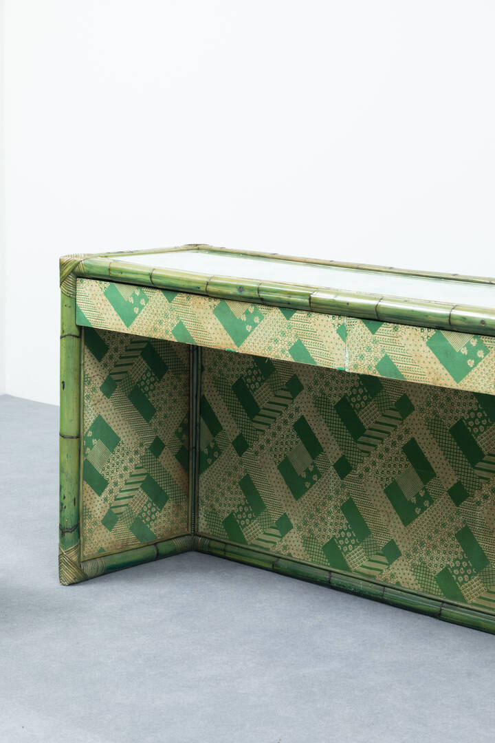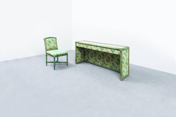 Scrivania e sedie con struttura in bamboo verniciato, imbottitura rivestita in tessuto.