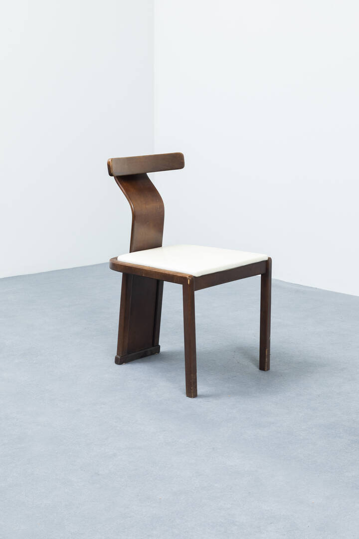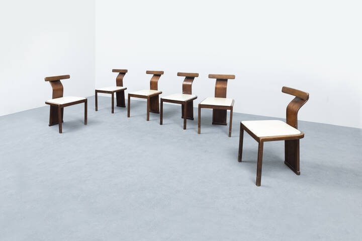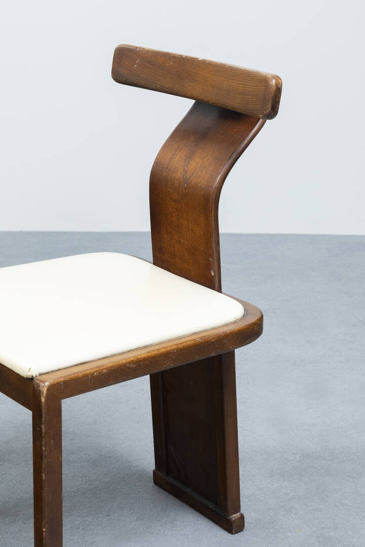 Sei sedie con schienale in legno curvato, seduta imbottita rivestita in similpelle.