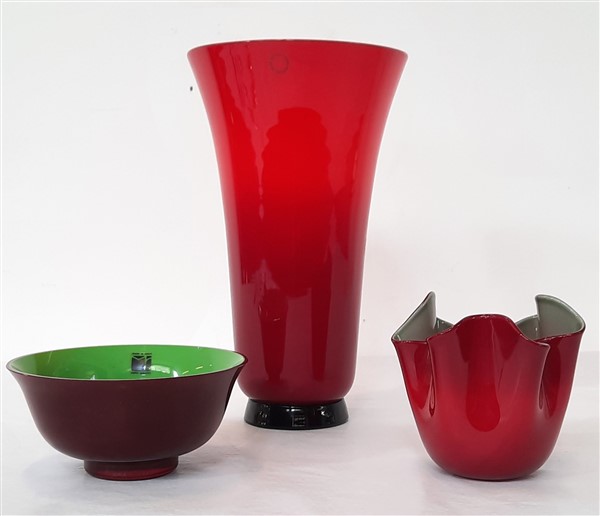Lotto composto da un centrotavola in vetro incamiciato rosso e verde di Carlo Moretti, un vaso in vetro soffiato rosso firmato a punta sotto la base "Venini 97" e un vasetto a fazzoletto in vetro incamiciato rosso e verde dedicato e firmato a punta sotto la base "Venini 2006". Murano, produzione recente. (h max cm 27)