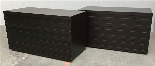Coppia di cassettiere a tre cassetti. Italia, 2009. Legno di rovere tinto nero. (cm 120x68x57,5) (difetti)