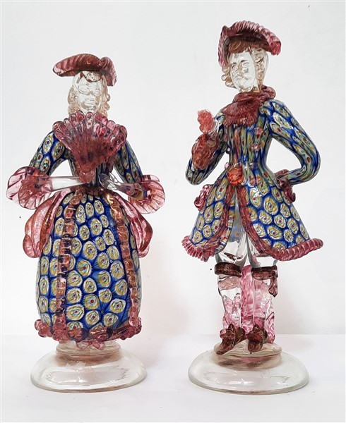 Lotto di due sculture raffiguranti dama e gentiluomo in vetro trasparente incolore e ametista con inclusione di foglia d'oro, vesti a murrine policrome. Seconda metà secolo XX. (h max cm 32)