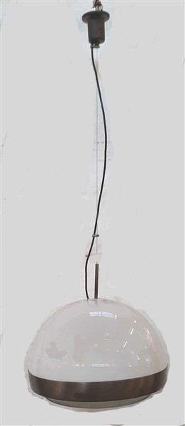 Lampada a sospensione con calotta in vetro soffiato in stampo trasparente incolore, perspex bianco, fascia in ottone. Italia, anni '60. (h cm 30; d cm 42) (lievi difetti)
