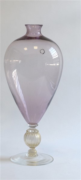 Vaso in vetro soffiato trasparente ametista con base in vetro trasparente incolore e foglia d'oro. Murano, secolo XX. Firmato a punta alla base "V. Nason" e recante etichetta adesiva. (h cm 41)