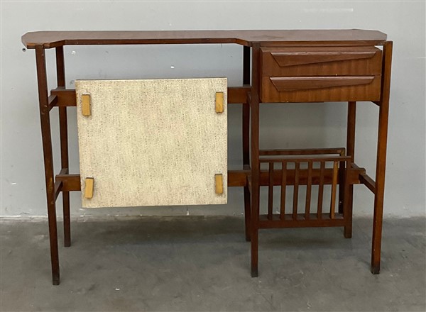 Piccola consolle in legno impiallacciato con due cassettini laterali e portariviste. Italia, anni '60. (cm 121x80x40,5) (difetti)