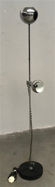 Lampada da terra a due luci globulari, delle quali una regolabile in altezza, con struttura in acciaio cromato e base in ghisa. Italia, anni '70. (h cm 166) (lievi difetti)