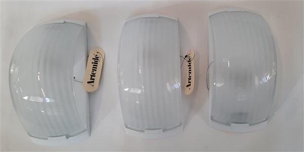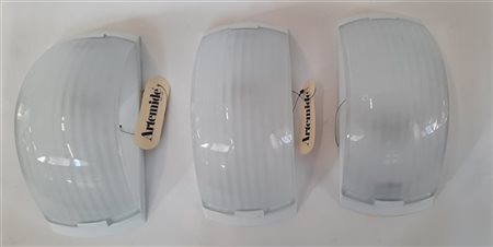 Gruppo di tre lampade da parete modello "Giasole". Produzione Artemide, Milano, secolo XX. Acciaio verniciato bianco, vetro stampato acidato sulla superficie interna. Recanti etichetta della produzione, in scatola originale, ancora imballate. (cm 30,5x13x12,5)