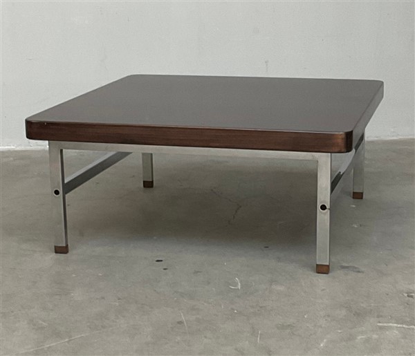 Tavolino da salotto con struttura in metallo, piano e piedini in legno. Italia, anni '70. (cm 80x35x80) (lievi difetti)
