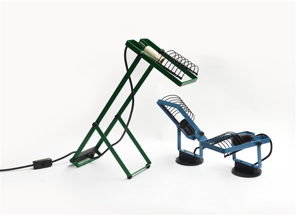 Lotto composto da una lampada da tavolo modello "Sintesi tavolo" unita a due lampade da parete modello "Sintesi parete". Produzione Artemide, Milano, 1975. Acciaio verniciato azzurro e verde. Marcata sotto la base. (misure diverse) (lievi difetti e modifiche)