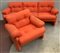 Lotto composto da un divano a tre posti e una poltrona modello "Coronado". Produzione B&B, Italia, 1966. Rivestimento in tessuto arancione. Recanti etichetta della produzione. (divano cm 205x69x90; poltrona cm 93x69x90) (lievi difetti)