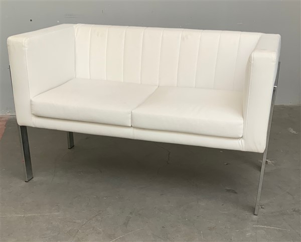 Divano a due posti con struttura in acciaio cromato e rivestimento in similpelle bianca. Italia, produzione recente. (cm 123x75x62) (lievi difetti)