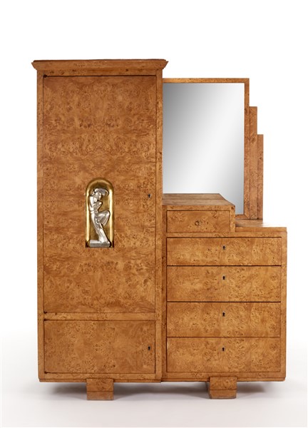 Mobile da camera Art Déco in legno impiallacciato in radica di olmo con specchiera, cinque cassetti e due ante di cui quella centrale con bassorilievo in legno dipinto, raffigurante una danzatrice. Italia, anni '30. (cm 140x190x50) (lievi difetti)