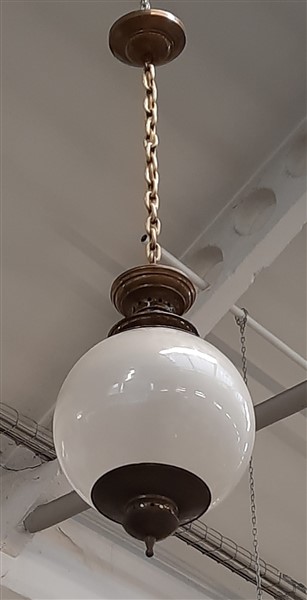 Lampada a sospensione modello "LS1GC lampione". Produzione Azucena, Milano, 1954. Ottone e vetro soffiato parzialmente satinato sulla superficie esterna. (h cm 105)