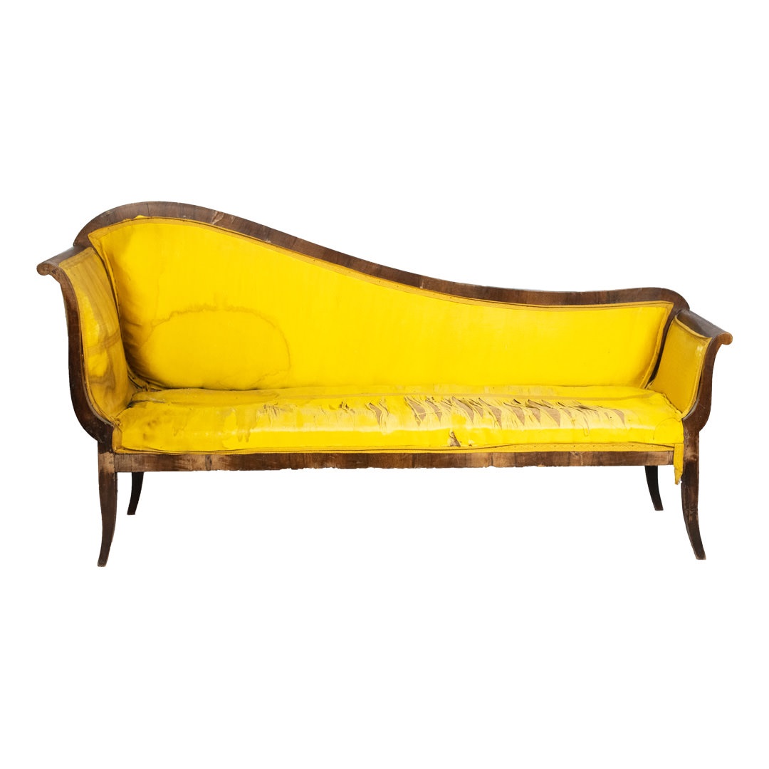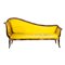 in noce, spalliera sagomata, gambe a sciabola, ricoperta in seta gialla, difetti