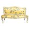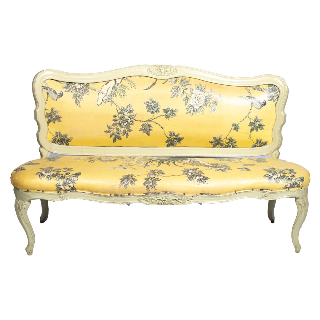 in legno intagliato e laccato grigio, spalliera sagomata, gambe mosse, ricoperto in tessuto giallo a motivi floreali