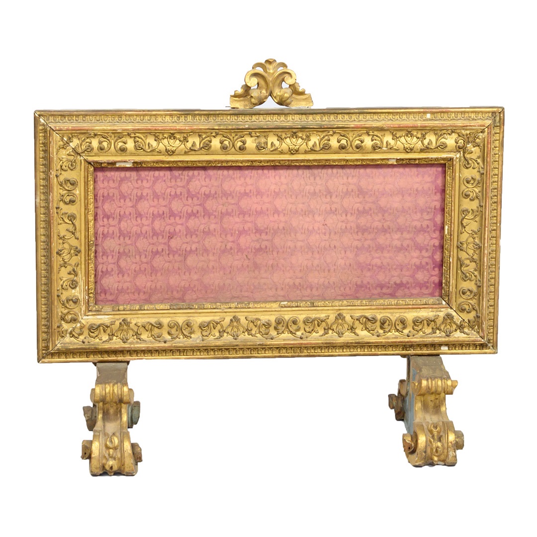 in legno dorato ed intagliato, con broccato rosa all'interno. Trattasi di cornice assemblata ad altri elementi antichi