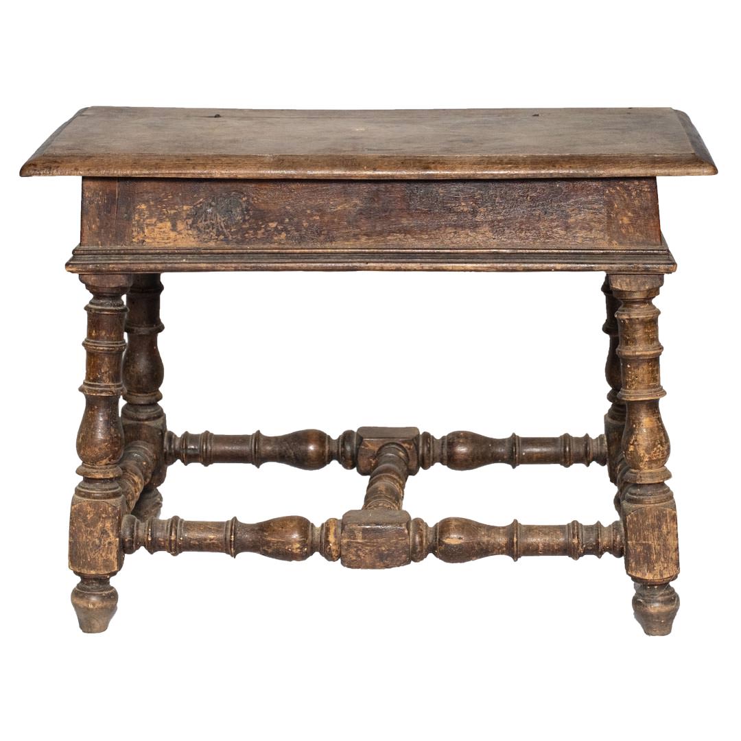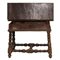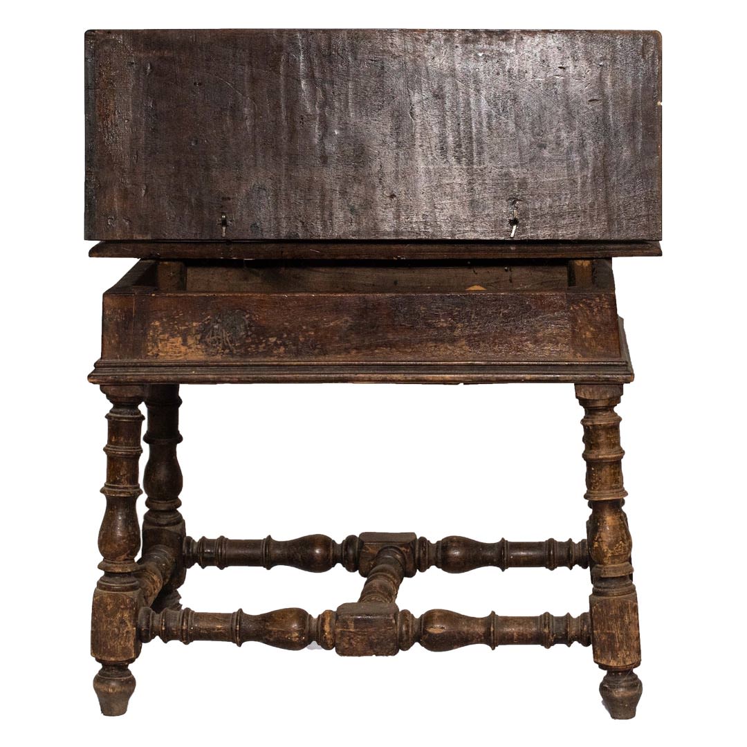 in noce, piano rettangolare apribile con becco di civetta, gambe tornite a rocchetto raccordate da traverse analogamente lavorate