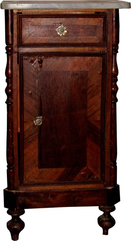 in legno noce e radica, piano in marmo, un cassetto ed uno sportello fra lesene tornite, piedi a trottola