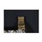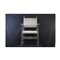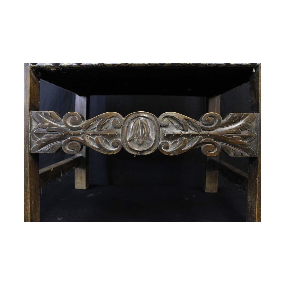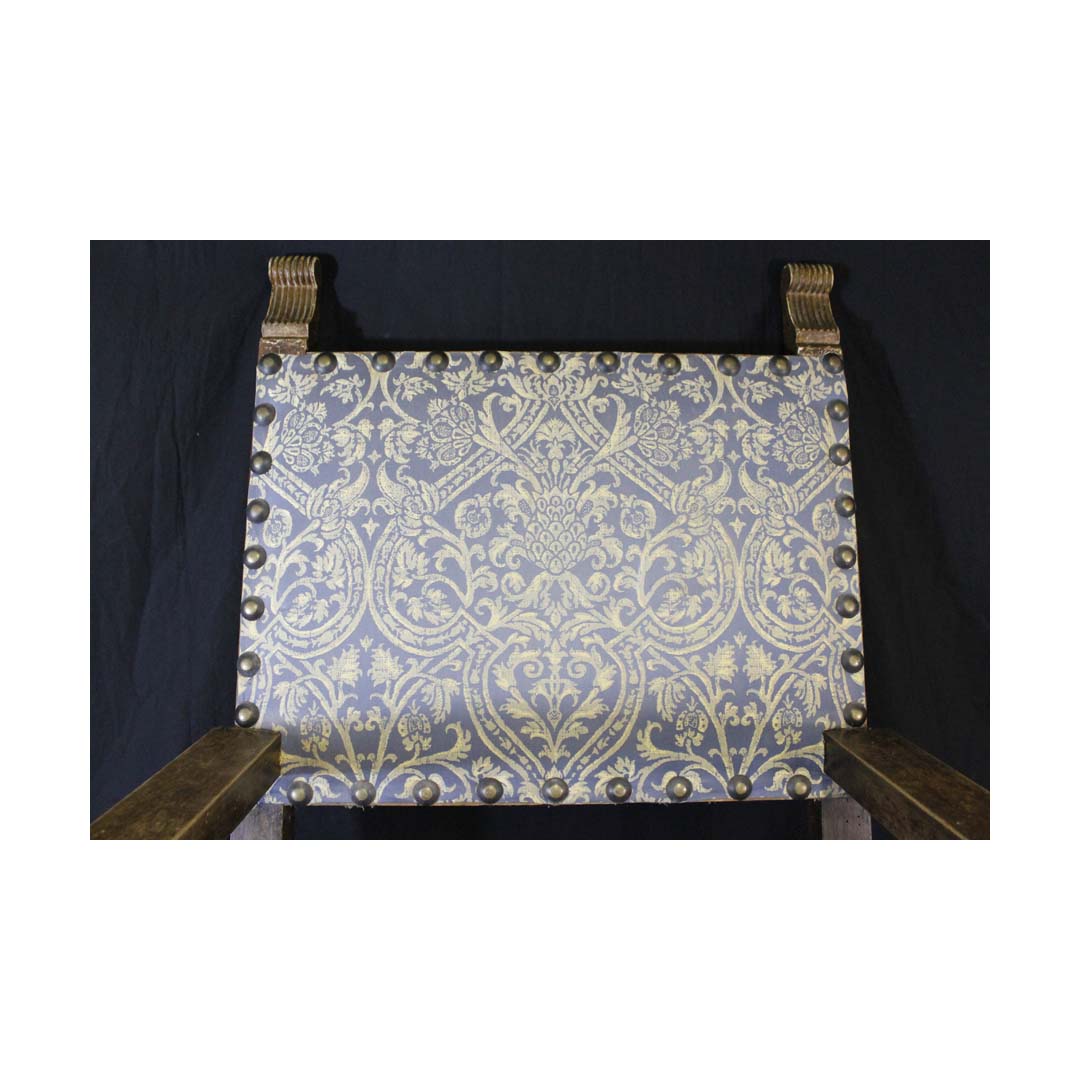 in noce, schienale con finali intagliati e braccioli lineari sorretti da balaustro, gambe lisce riunite da traversa intagliata a volute. Spalliera e seduta ricoperte con tessuto damascato