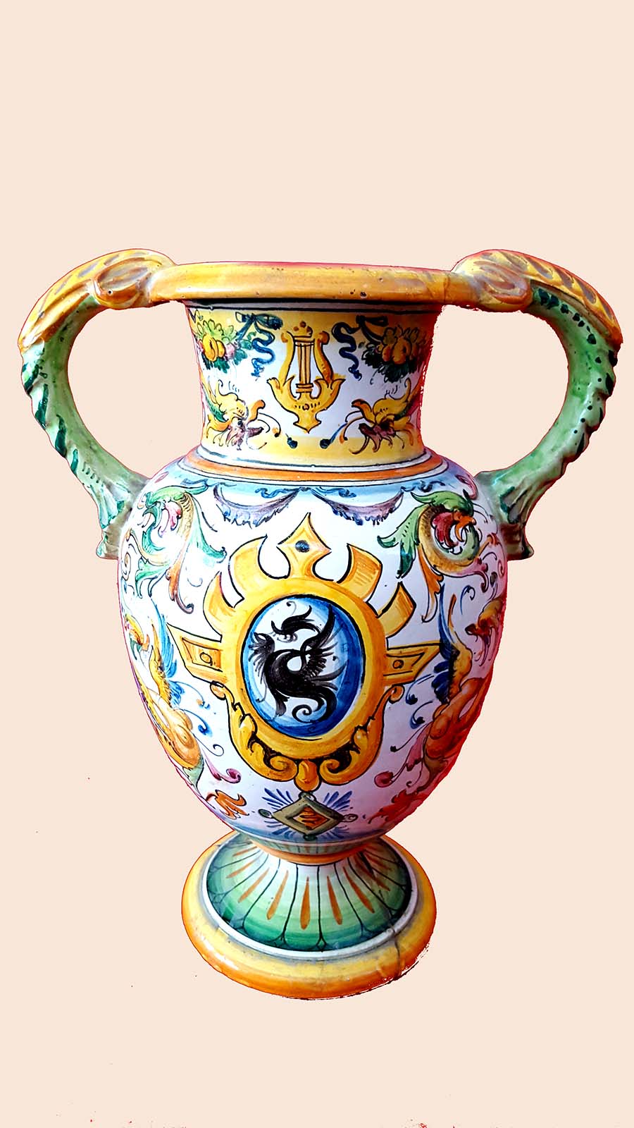 in ceramica policroma, manifattura Sesto Fiorentino dipinta a grottesche con decori vegetali e stemma centrale, lievi difetti