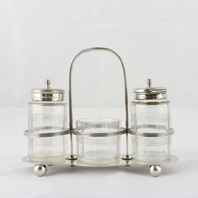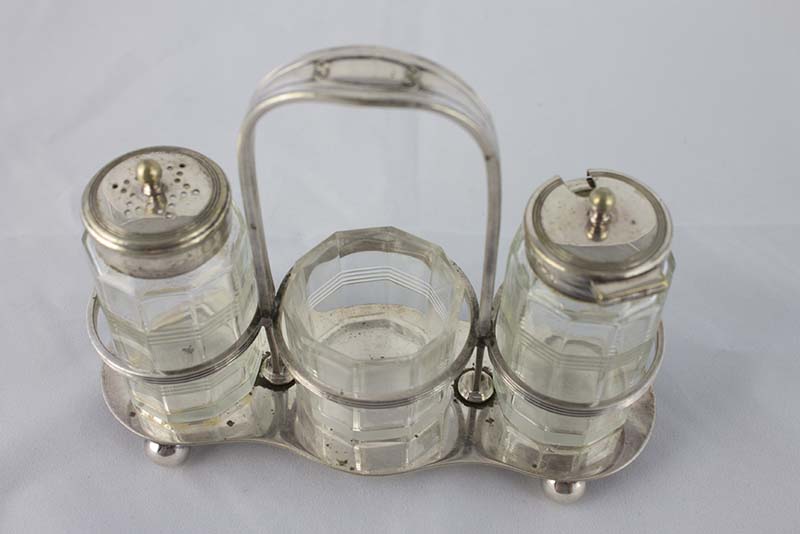 in sheffield, composto da un porta sale, porta pepe ed una vaschetta in vetro inciso