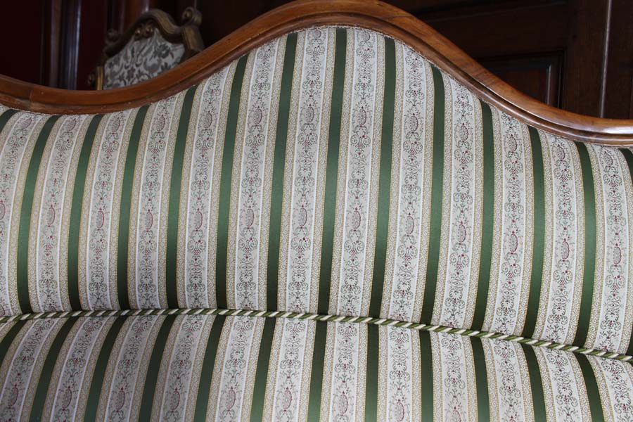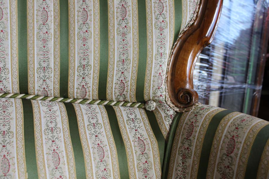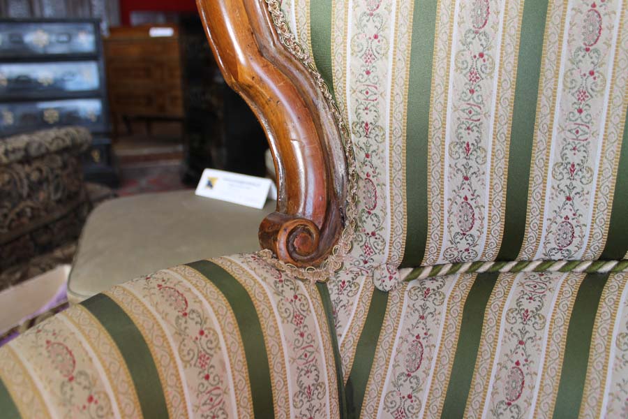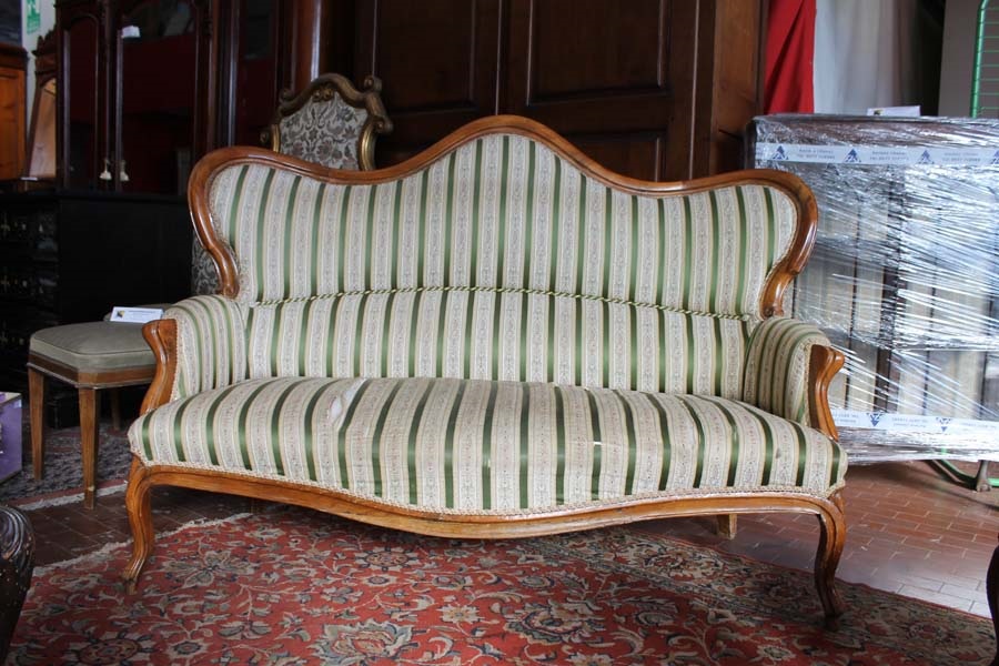in noce, schienale sagomato; seduta, schienale e braccioli ricoperti in stoffa a righe, gambe sinuose, tappezzeria da rivedere, difetti