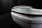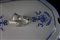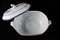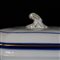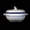 in porcellana bianca e filettature in blu e oro, coperchio con presa a voluta fitomorfa e due manici laterali, marcata Copeland England