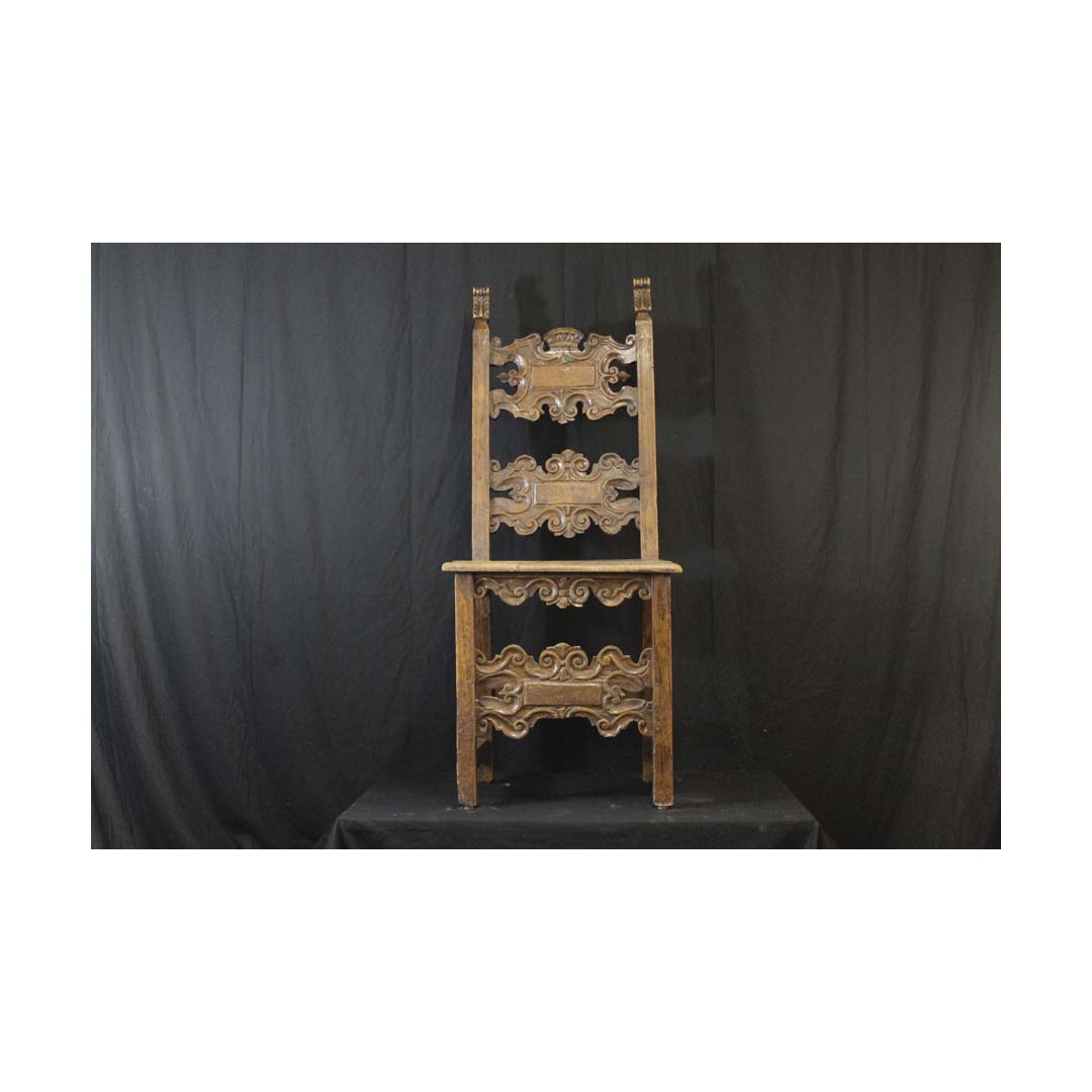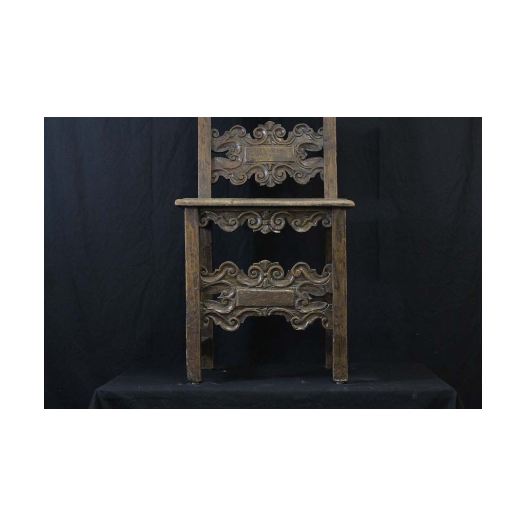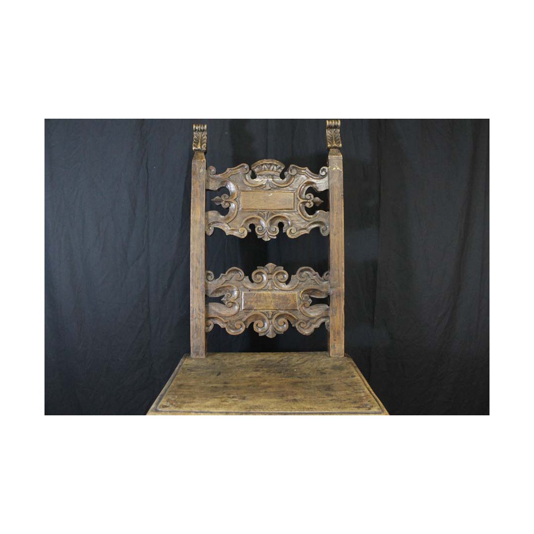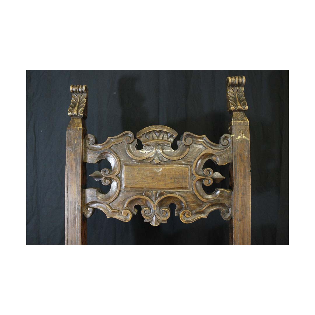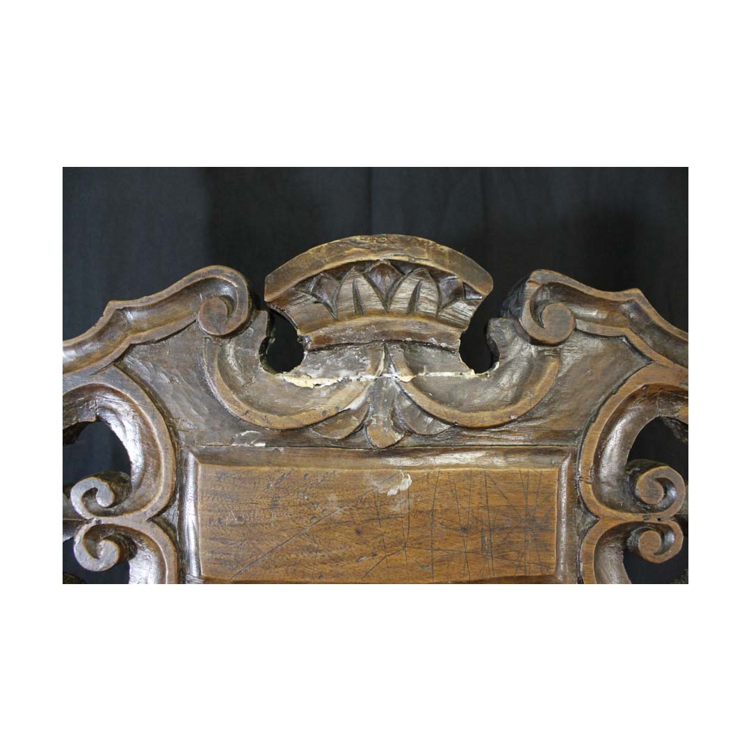 in noce scolpito ed intagliato, spalliera con finali a fiamma, due cartelle sagomate a volute, gambe rettilinee riunite da cartella analoga a quelle della spalliera, piccoli difetti