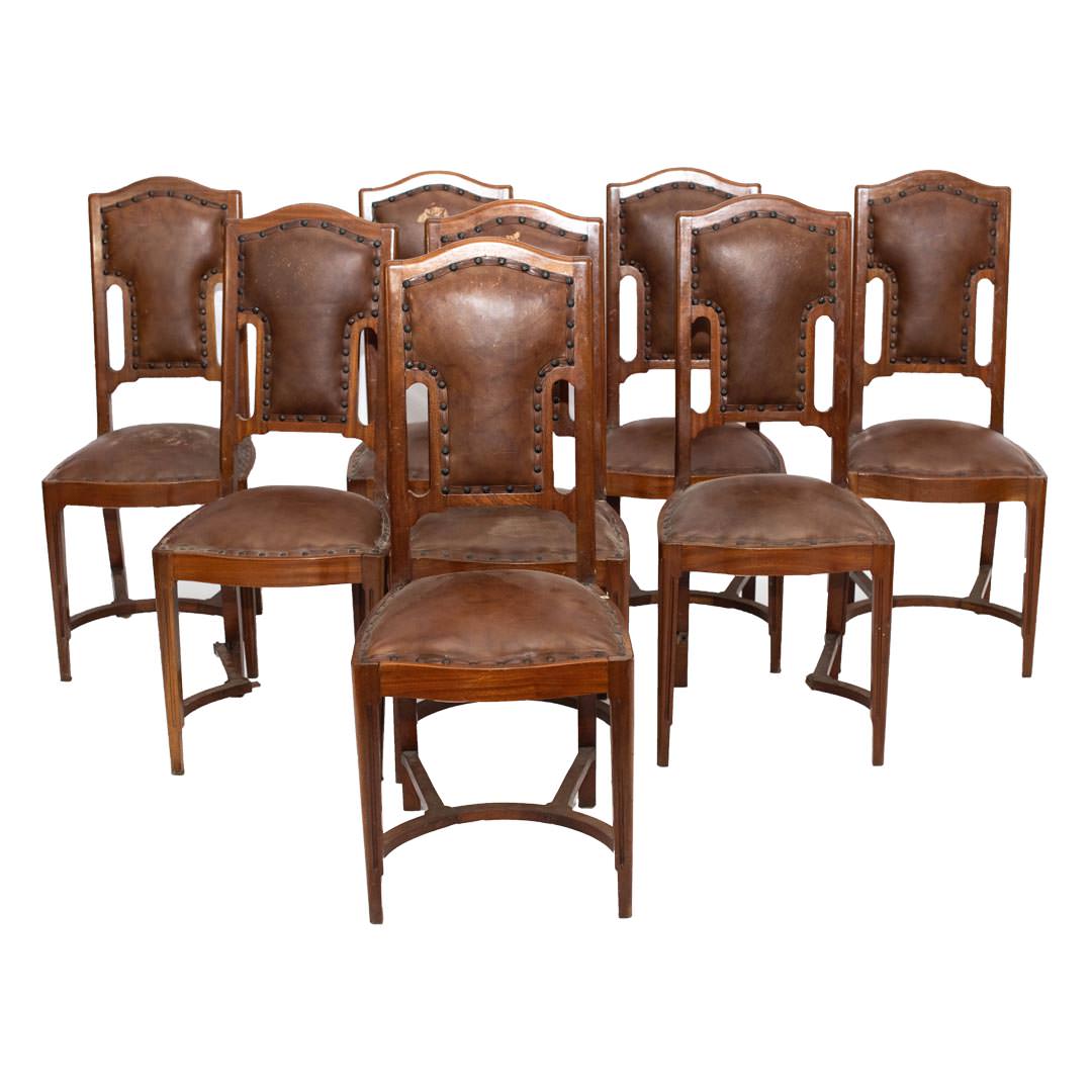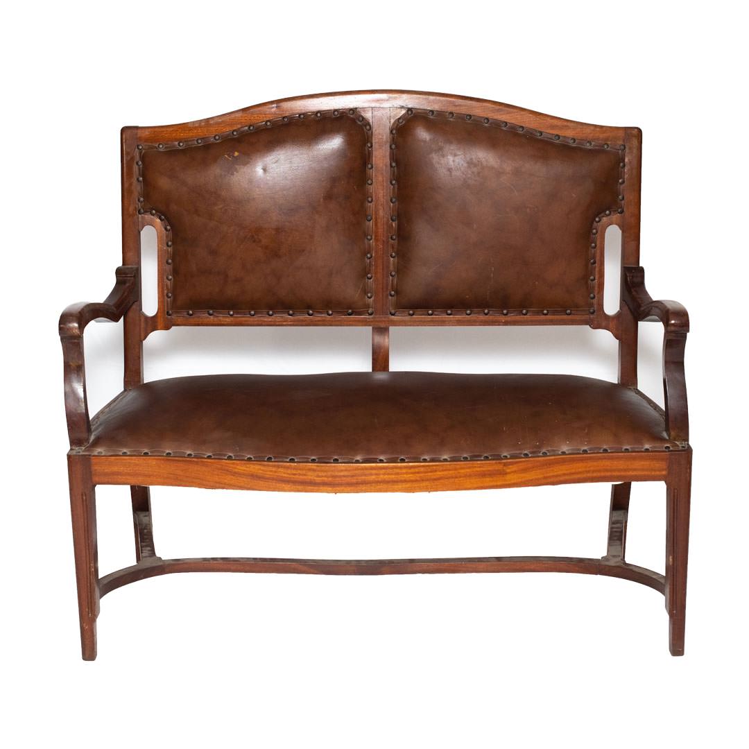 in mogano, composto da un divano a due posti e otto sedie, schienali e sedute rivestiti in pelle, (9)