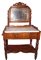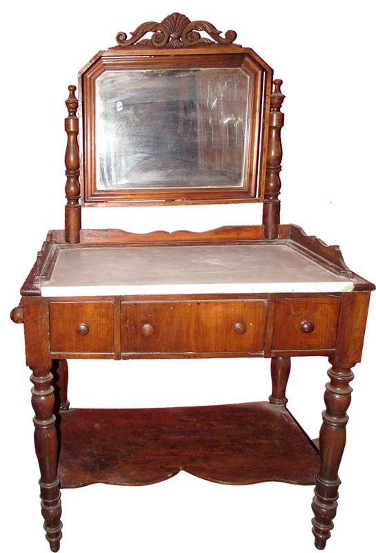in noce, con specchiera a bilico e cimasa a volute, piano in marmo bianco, fascia con due cassettini laterali ed un cassetto centrale, gambe tornite raccordate da ripiano di linea sagomata, portasciugamani laterali torniti