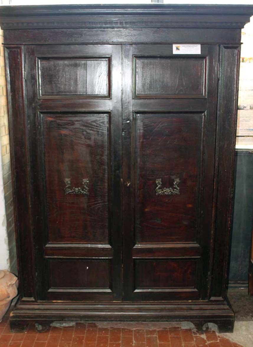 in legno di castagno a due ante pannellate sormontate da cappello aggettante intagliato a motivo dentellato, piedi a mensola, maniglie a foggia di mascherone sorretto da putti