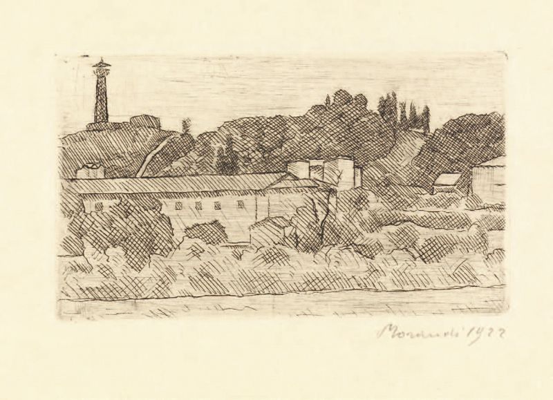 Giorgio Morandi Bologna 1890 - 1964 Paesaggio (Veduta dell'Osservanza a Bologna), 1922 Acquaforte su rame, cm. 7,2x12,3 (lastra), cm. 18,3x24,8 (carta) Firma e data a matita sul margine in basso a destra: Morandi 1922. Stato unico: tiratura probabilmente non oltre 18 esemplari, di cui 5 non numerati e gli altri numerati dal 3 al 5 e dal 9 al 18, alcuni su carta Giappone. Qualche prova di stampa. Bibliografia Lamberto Vitali, L'opera grafica di Giorgio Morandi, Giulio Einaudi Editore, Torino, 1964, n. 16; Michele Cordaro, Morandi incisioni. Catalogo Generale, Edizioni Electa, Milano, 1991, p. 16, n. 1922 1.