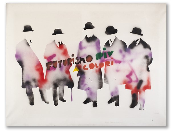 Mario Schifano "Futurismo rivisitato a colori" 1976 smalto e spray su tela cm 13
