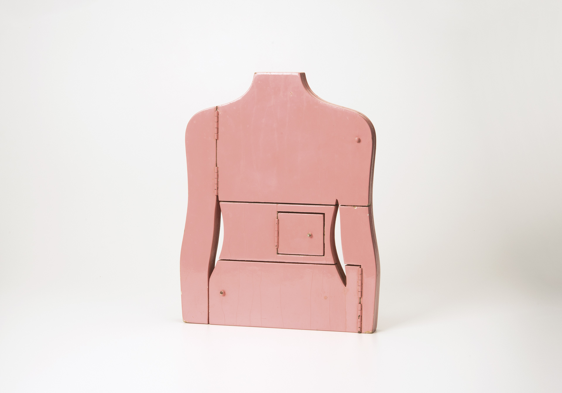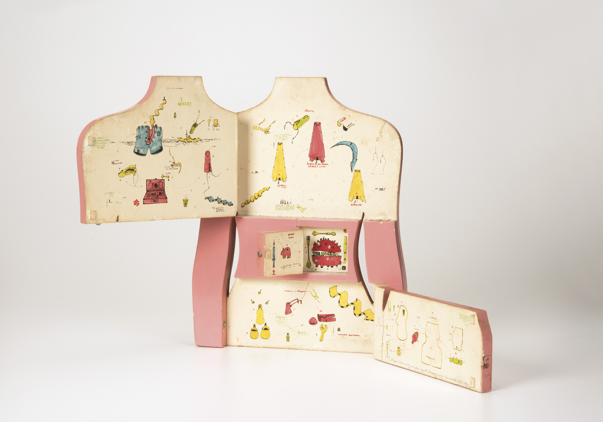 Gianfranco Baruchello (Livorno 1924) Interiority complex, 1966/1976;China col. a mano su carta applicata su legno e smalto , 65 x 36 cm (aperto), lievi macchie e fioriture sulla carta, alla base lievi mancanze di colore e abrasioni nel legno. Iscrizione a matita “oggetto colorato a mano