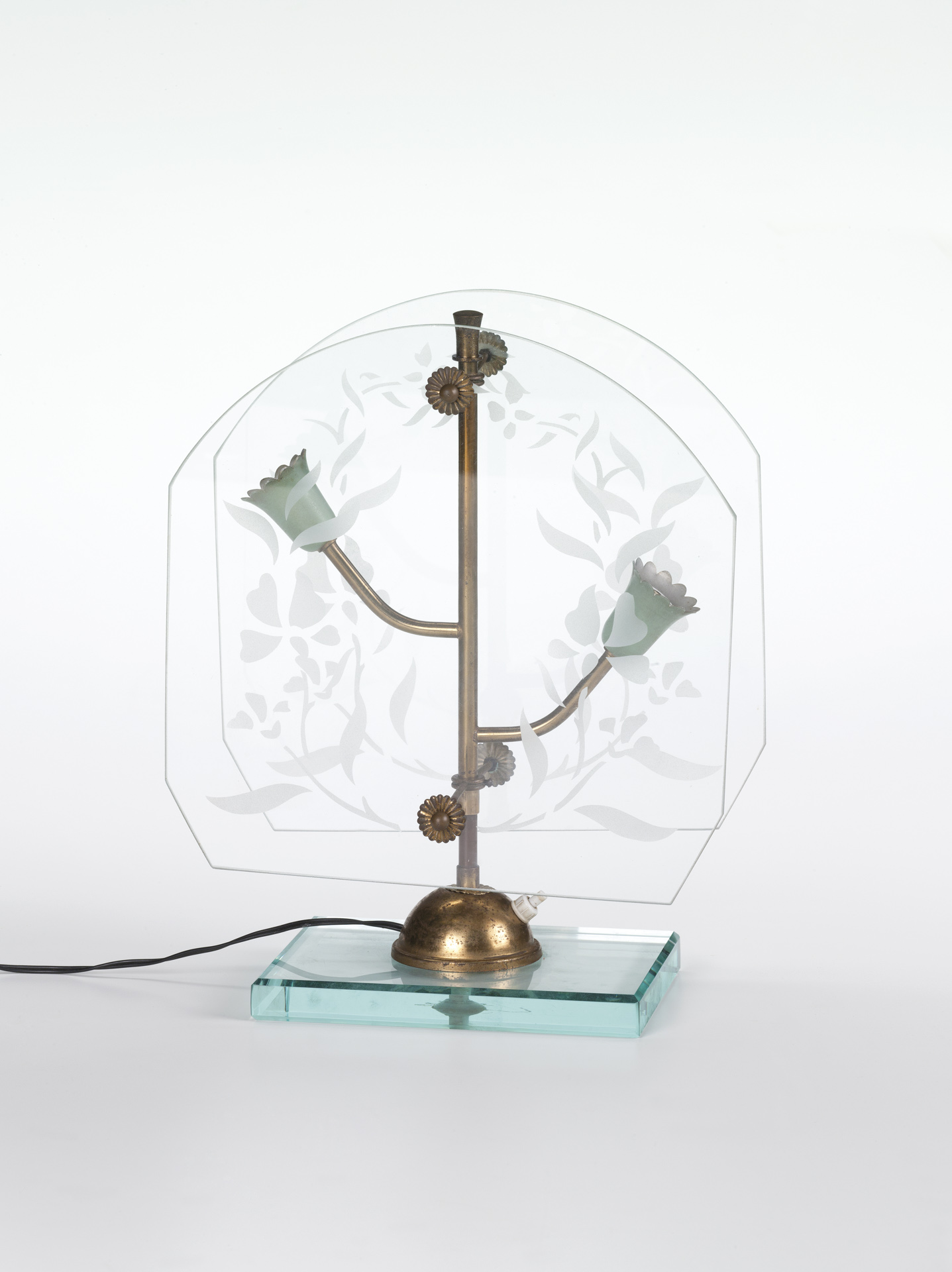 Pietro Chiesa Lampada da tavolo, 1940 circa;su piede in vetro verde Nilo e ottone con cristalli sagomati e molati a motivi vegetali, 36 x 29 x 15 cm, produzione Fontana Arte Milano