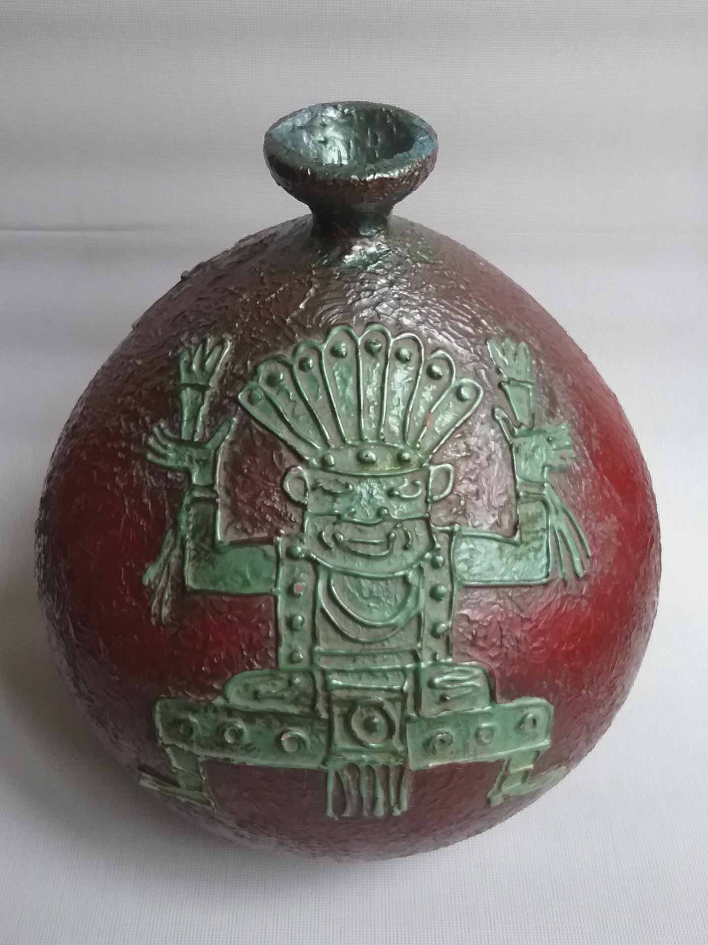 Manufaktur/Manifattura Ancora Venezia Raro vaso panciuto, 1950/60;in ceramica smaltata rosso rubino con decorazioni a rilievo di motivi precolombiani a smalto verde. Perfette condizioni.