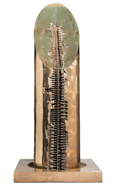 Arnaldo Pomodoro Morciano di Romagna (Fc) 1926 Colonna recisa trasversalmente, 1970-71 Scultura in bronzo, cm. 269 h. (con base) Firma e data sulla base: Arnaldo Pomodoro, 1970/71: targhetta con dati dell'opera. Storia Marlborough Gallery, New York; Collezione privata Foto autenticata dall'artista, Milano gennaio 2009, con n. 336. Esposizioni Arnaldo Pomodoro: un centesimo di secondo, Milano, Studio Marconi, giugno 1971; Arnaldo Pomodoro. Gross-Plastiken, Darmstadt, Freyräume und Foyers des Staatstheaters, autunno 1972, cat. fig. 26, illustrata; VII Biennale Internazionale di Scultura Città di Carrara, sala di rappresentanza del Comune, luglio - agosto 1973; Arnaldo Pomodoro, Milano, Rotonda della Besana, giugno - agosto 1974, cat. p. 64, illustrata; Arnaldo Pomodoro, New York, Marlborough Gallery, 22 ottobre - 20 novembre 1976, cat. p. 41, illustrata; Pomodoro in Spectrum, Dallas, Spectrum Center, 6 giugno - 1 ottobre 1976, cat. p. 6, illustrata; Arnaldo Pomodoro: A Quarter Century, Columbus, Columbus Museum of Art, 1983-84, cat. tav. 17, illustrata; Luoghi fondamentali, Sculture di Arnaldo Pomodoro, Firenze, Forte Belvedere, 7 luglio - 28 ottobre 1984, cat. p. 107, illustrata; Arnaldo Pomodoro, Rimini, Museo della Città, 10 giugno - 30 luglio 1995, cat. p. 29, illustrata; Arnaldo Pomodoro, Terni, Palazzo della Bibliomediateca, 3 dicembre 1995 - 7 gennaio 1996, cat. p. 61, illustrata; Arnaldo Pomodoro, Palma di Maiorca, Llonja, Circulo de Bellas Artes, 5 agosto - 30 settembre 1999; Arnaldo Pomodoro dans les Jardins du Palais-Royal, Parigi, 15 aprile - 31 agosto 2002; Arnaldo Pomodoro, Lugano, Centro cittadino, 26 marzo - 13 giugno 2004, cat. p. 57, illustrata a colori. Realizzata in due esemplari più una prova d'artista. Bibliografia Flaminio Gualdoni, Arnaldo Pomodoro. Catalogo ragionato della scultura, tomo II, Skira Editore, Ginevra - Milano, 2007, p. 567, n. 519.