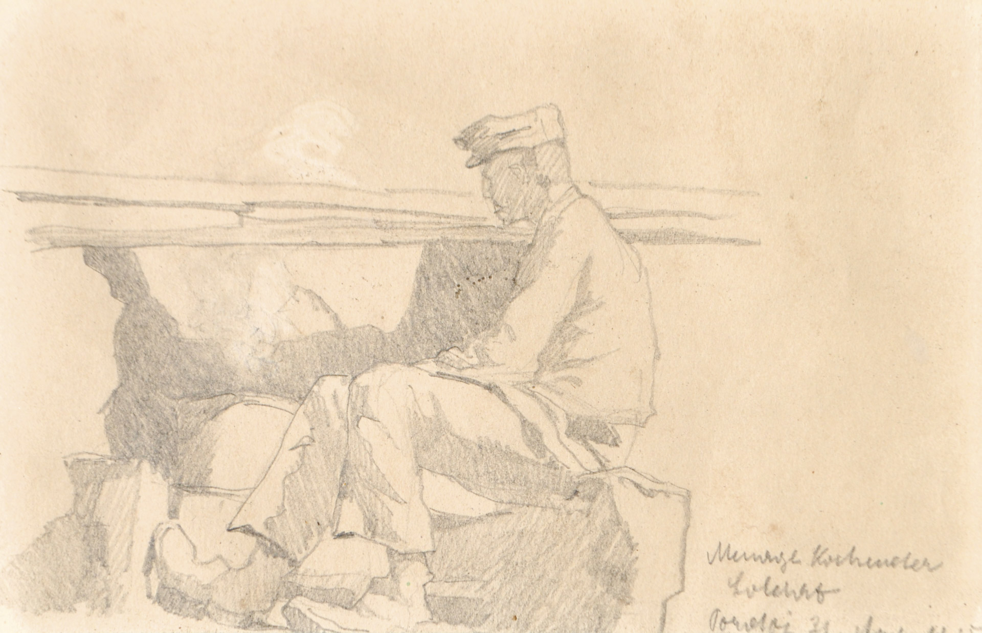 Thomas Riss (Haslach, Stams 1871 – Innsbruck 1959) Soldato in cucina, Pordoi, 1915;Matita, 12 x 19 cm, in cornice