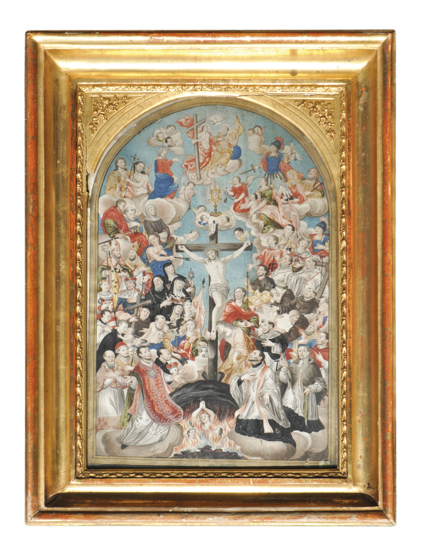 Maler um 1800/Pittore del 1800 ca. Gesù crocifisso tra santi, religiosi e angeli;Tempera su carta, 42,5 x 48 cm, in cornice