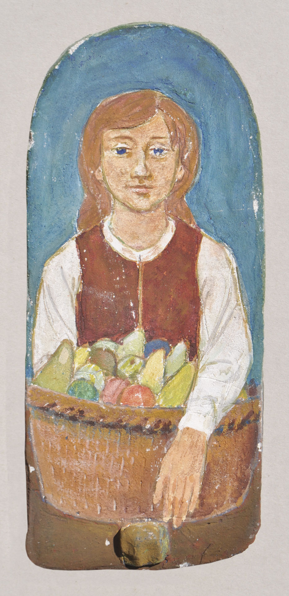 Hans Prünster (Riffian/Rifiano 1907 – Bozen/Bolzano 2005) Donna con cesto di frutta;Affresco e sgraffito su tegola, 40 x 17 cm