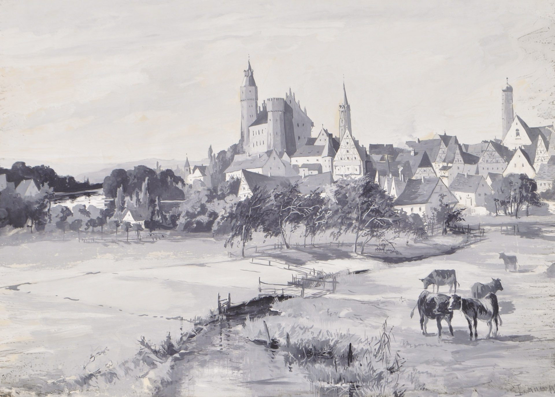 August Geiger-Thuring (München/Monaco di Baviera 1861 – 1896) Lauingen nel distretto di Dillingen sul Danubio (Baviera);Grisaglia, 48 x 63,5 cm, macchie fuori del passepartout, piccoli strappi laterali